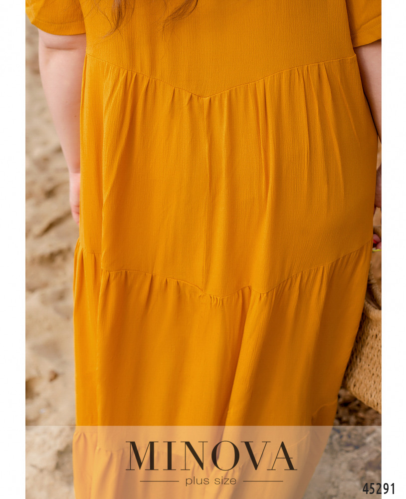 Яркое однотонное платье макси с короткими рукавами и V-образным вырезом горловины только на первый взгляд кажется минималистичным. Его изюминка - в воздушной выразительной спинке, ниспадающей плавными воланами, которая покорит вас с первого взгляда. Платье дополнено незаметными карманами в боковых швах.