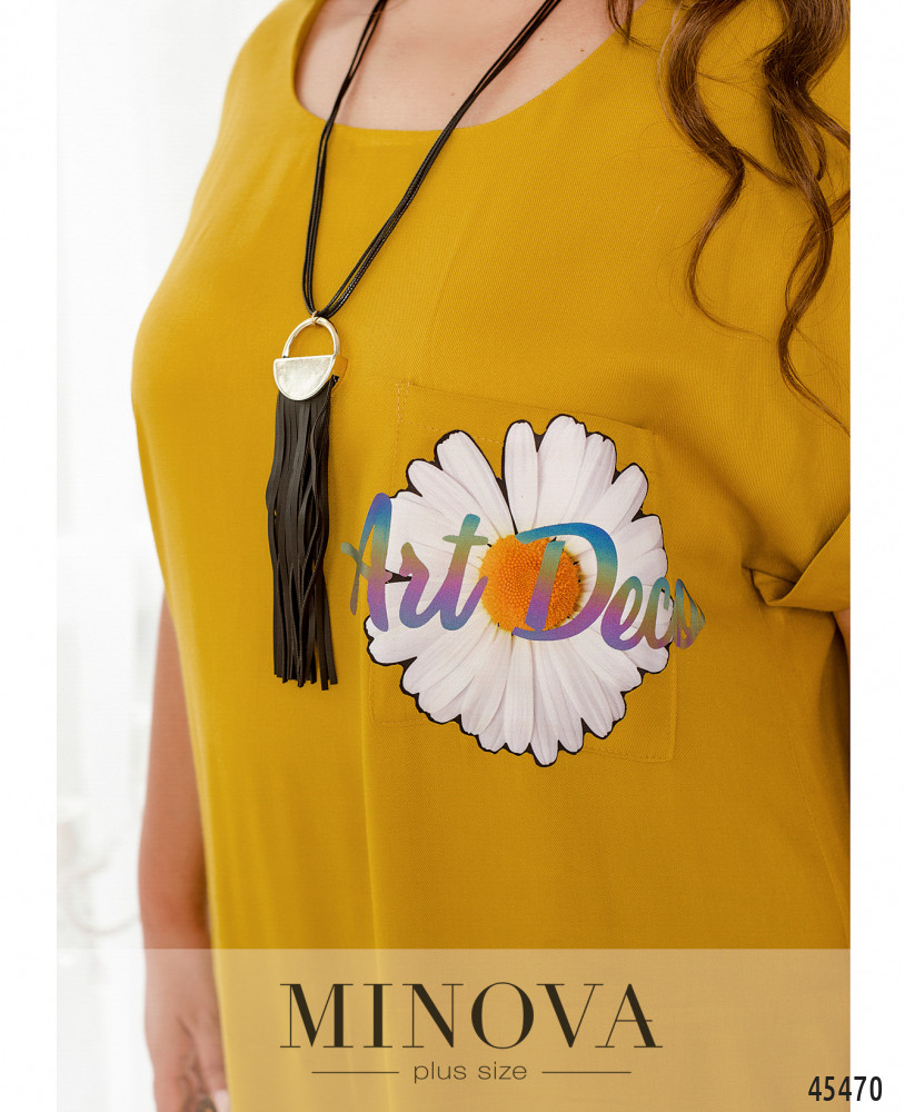 Универсальное женственное платье прямого кроя удачно впишется в любой стиль. Данная модель дополнена короткими рукавами с приспущенной линией плеча и отворотами, а также декоративным принтом на груди и разрезами по бокам, кокетливо приоткрывающими ваши ножки.