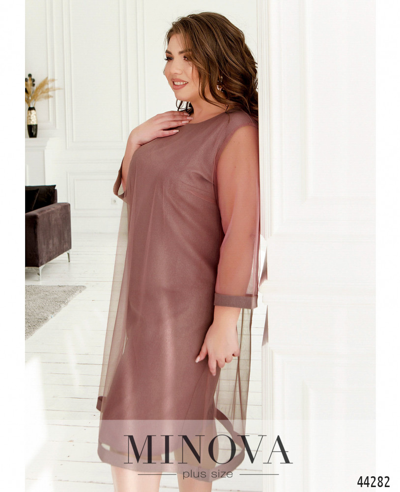 Нежное и воздушное платье батал с плотным нижним слоем и полупрозрачной верхней тканью. Рукава без подкладки, с плотными манжетами. Нижняя ткань с люрексом. На груди вытачки. Вырез горловины полукруглый. Застёжек и карманов нет.