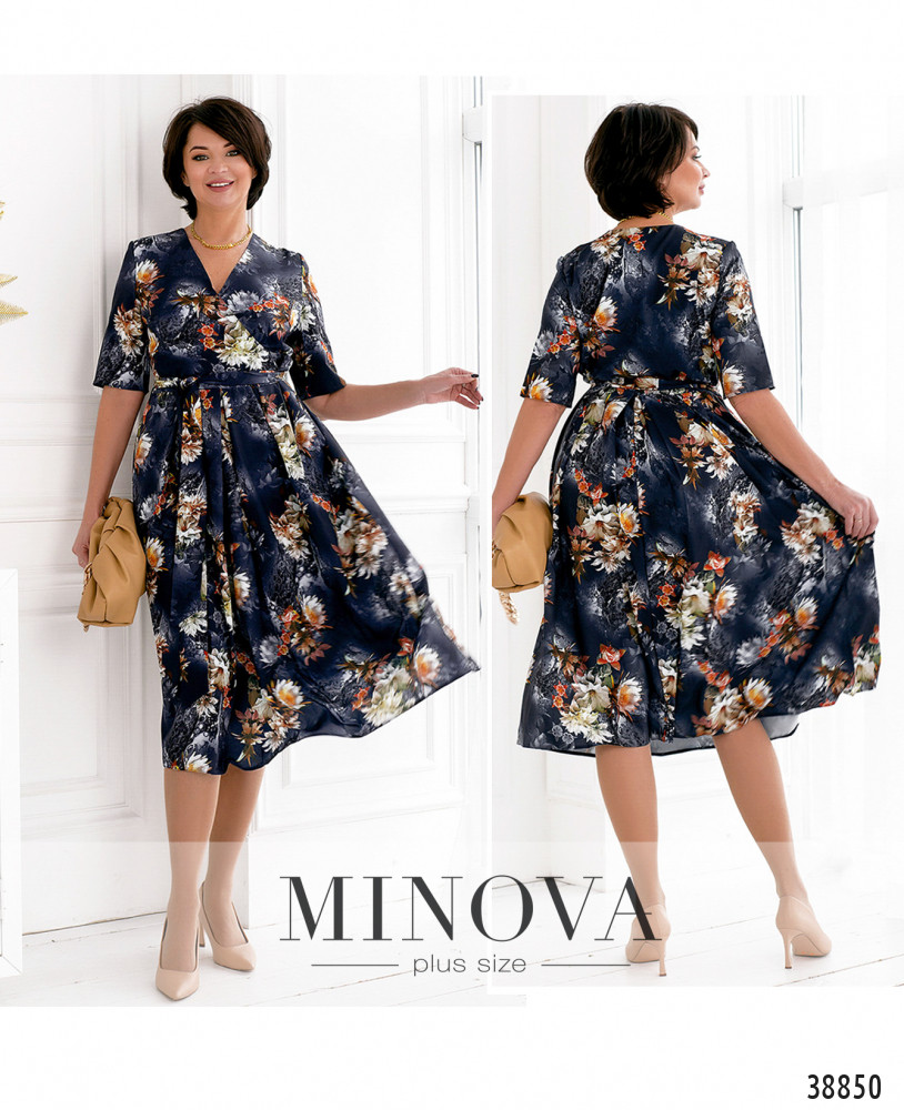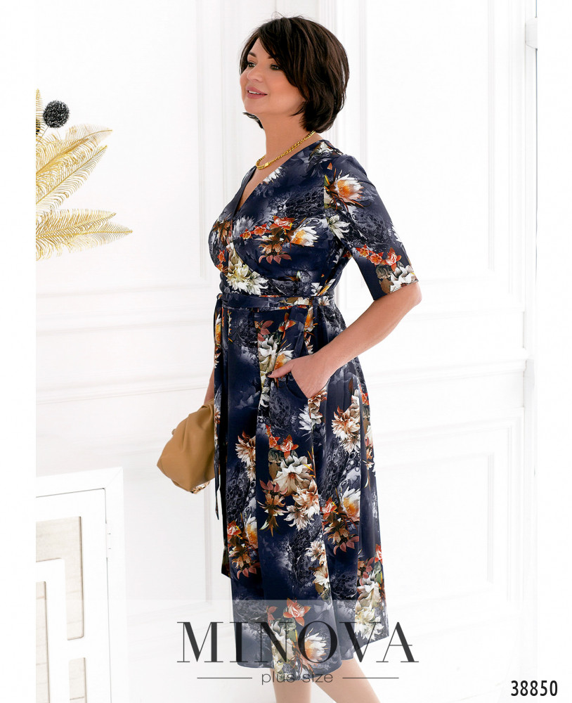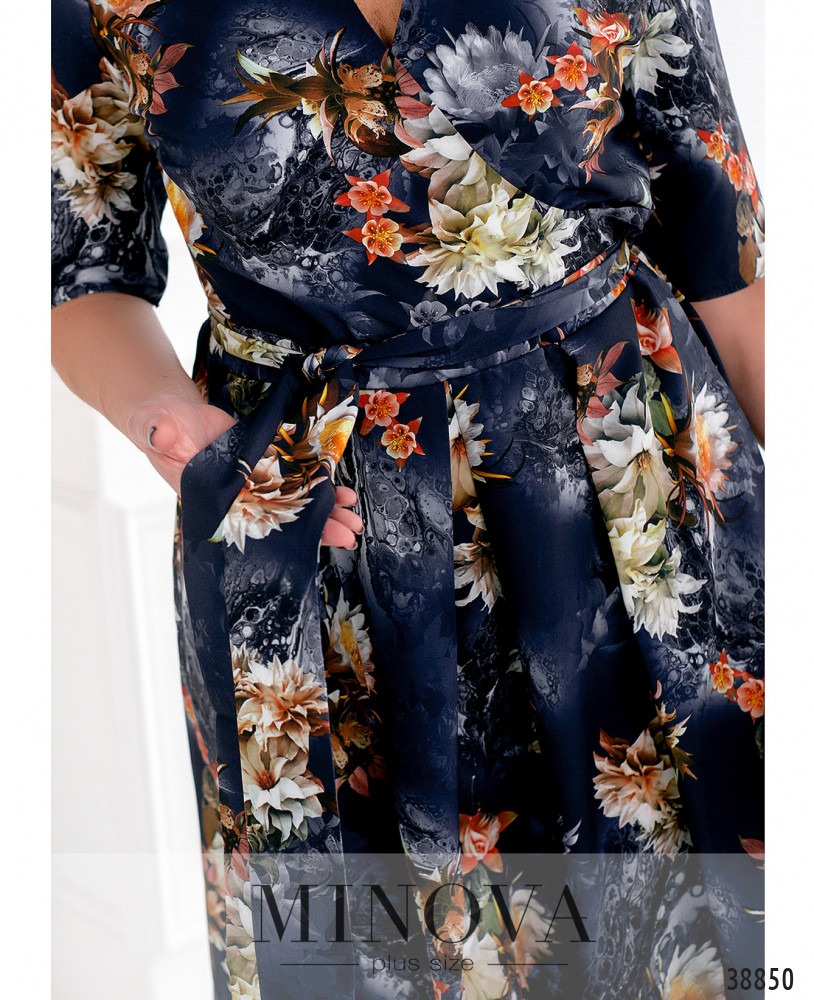 Яркое платье батал с цветочным принтом, верх подшит на запАх, подол подшит и присобран оборками. В комплекте - пояс в тон. Рукава - без манжет. На груди вытачки. В боковом шве платья потайная молния и карманы.
