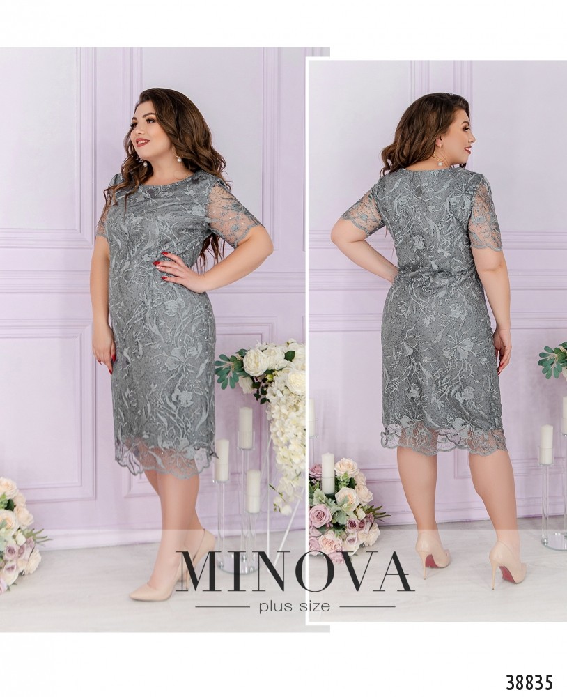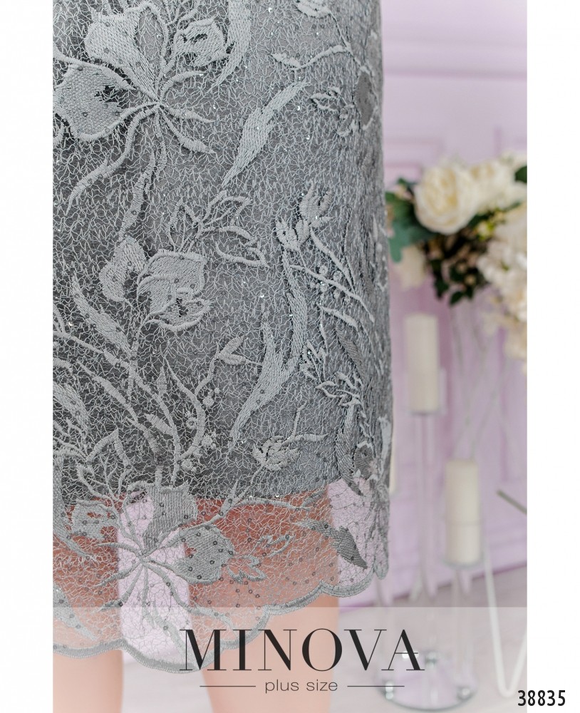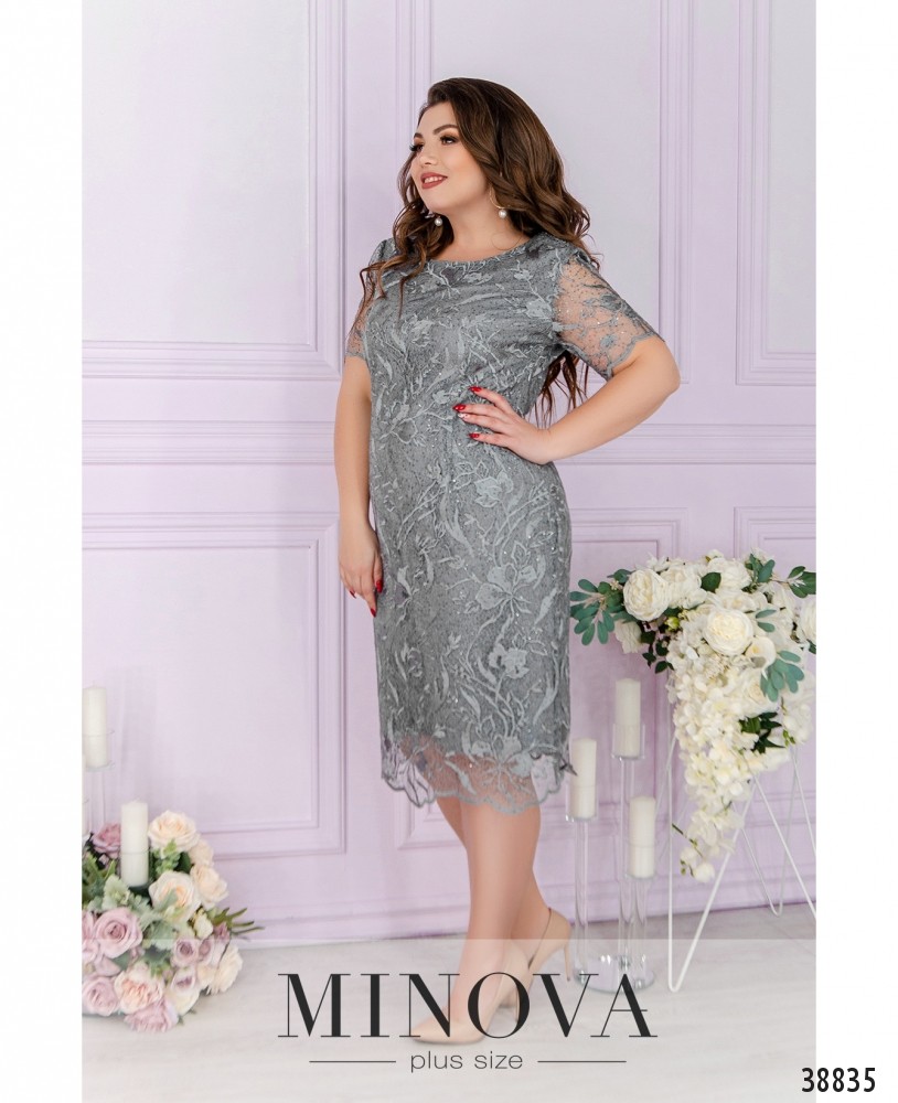 Женственное, элегантное и очень нежное платье большого размера с очаровательным гипюровым слоем сверху и мягкой, приятной к телу тканью в качестве нижнего слоя. Рукава - полностью из гипюра. Вырез горловины полукруглый, неглубокий.