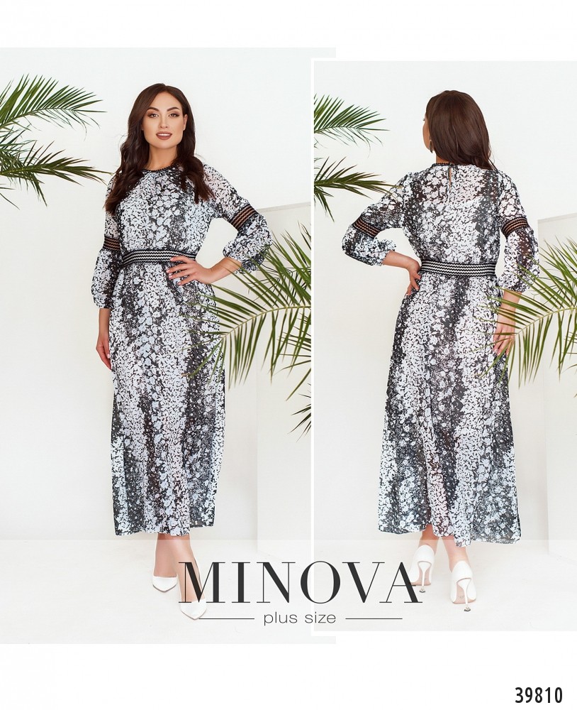 Оригинальное и очень привлекательное платье батал с рукавом фасона "рукав амазонки", присобранным в два буфа поперечной тесьмой. Карманов нет, застёжка - пуговка сзади на шее. Платье двуслойное: верхний слой полупрозрачный с узором, нижняя ткань мягкая, гладкая. В манжет и в пояс вшиты резинки.