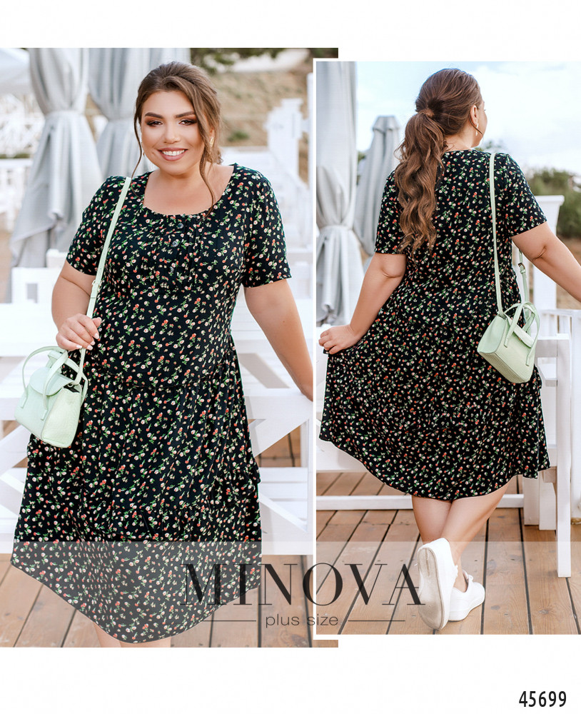 Нежное платье большого размера с двумя рядами оборок на подоле. Застёгивается на ряд пуговиц спереди на планке. Рукава короткие, без манжет. Карманов нет. На лифе спереди ткань присобрана плиссированными складками.