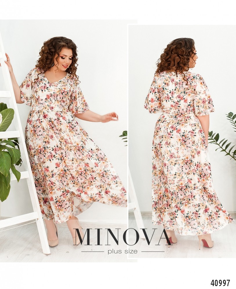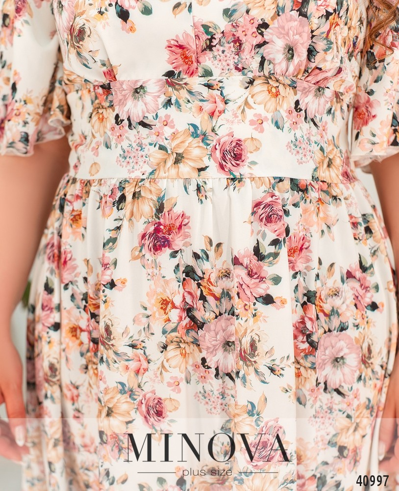 Яркое, нежное и женственное платье батал с подолом, присобранным мягкими оборками и отделённым от верха широкой полосой. Застёжка - вшитая по спинке потайная молния, карманов нет. Вырез горловины V-образный, рукава свободные, без манжет.