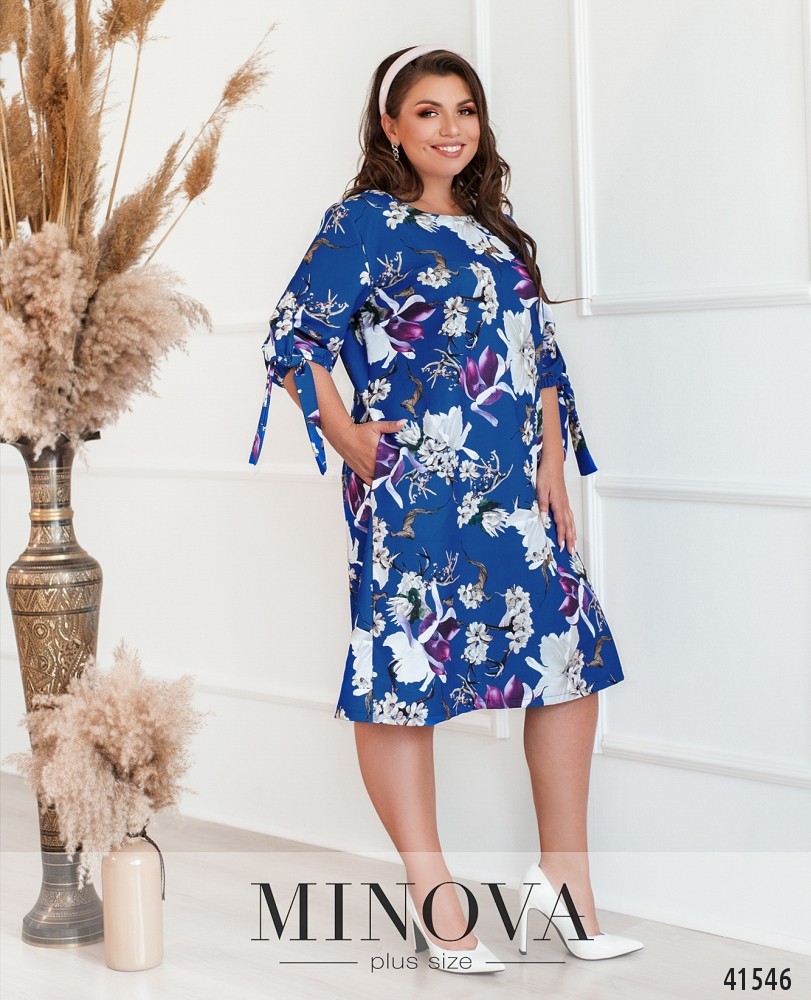 Яркое и привлекательное платье батал приталенного силуэта, рукава с прорезями, укреплёнными металлическими люверсами, через них пропущены ленты, завязываются на бант. По бокам - врезные карманы. Застёгивается на молнию, вшитую по спинке.