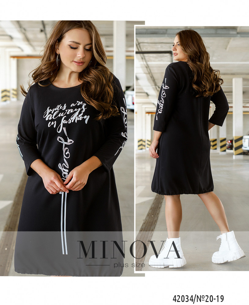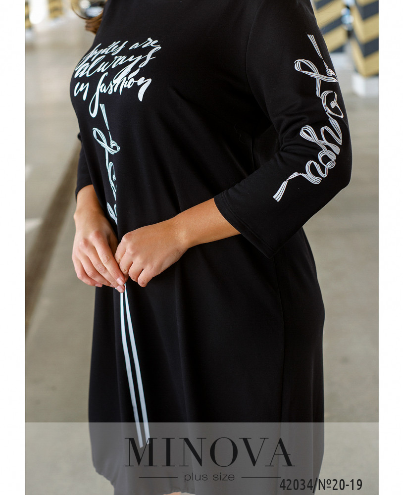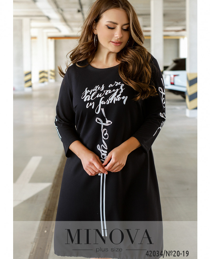 Стильное повседневное платье батал с ярким принтом на груди и на рукавах: на левом рукаве полосатые лампасы, на правом - принт. На груди вытачки. Застёгивается на змейку, вшитую по спинке. Карманов нет. Вырез горловины полукруглый. Через подол пропущен шнурок с затяжкой-клапаном.