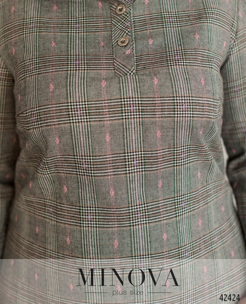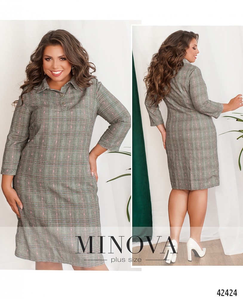 Минималистичное платье батал с отложным воротничком и тремя пуговицами от него. На груди вытачки, рукава без манжет. По бокам подола - разрезы, скреплённые рабочими пуговицами. Карманов нет.