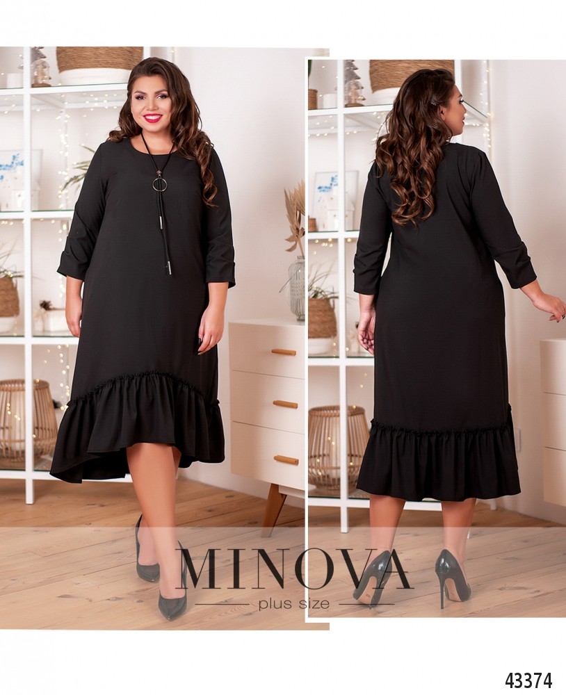 Стильное платье большого размера с оборками на подоле, рукава на запястьях присобраны. Вырез горловины полукруглый, на груди - вытачки. По бокам - врезные карманы. Застёжек нет. Украшение входит в комплект.
