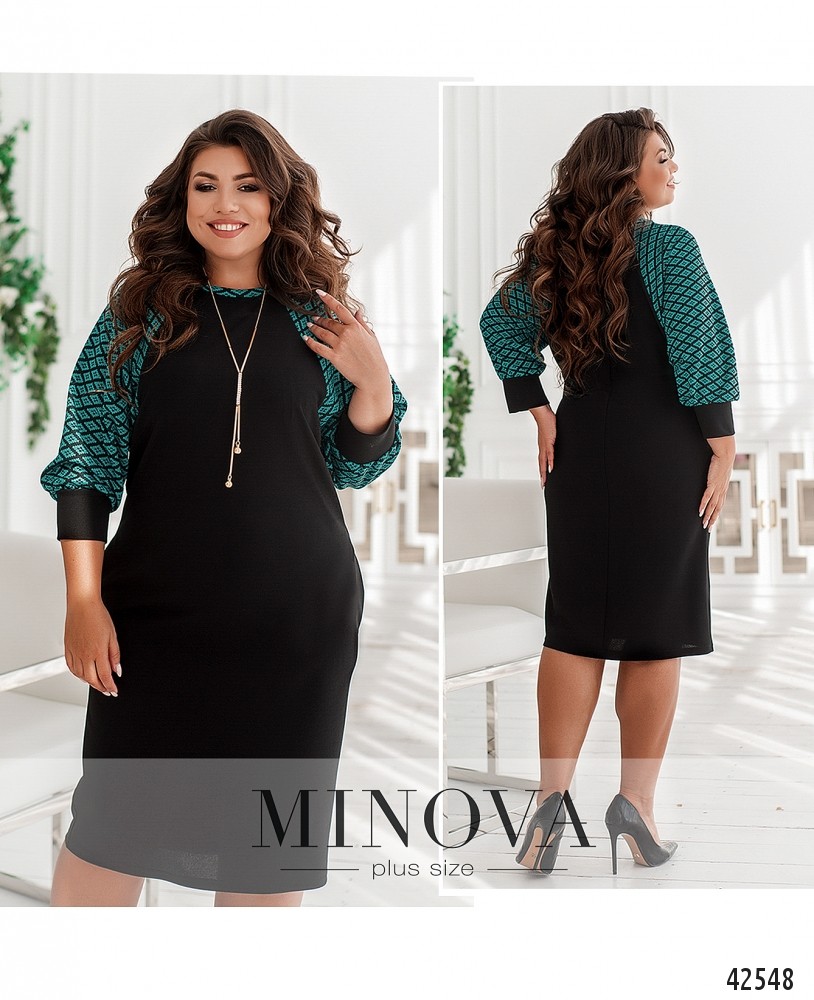 Оригинальное платье батал с контрастными рукавами и горловиной. На рукавах - мягкие манжеты без пуговиц. Застёжек нет, по бокам - врезные карманы.