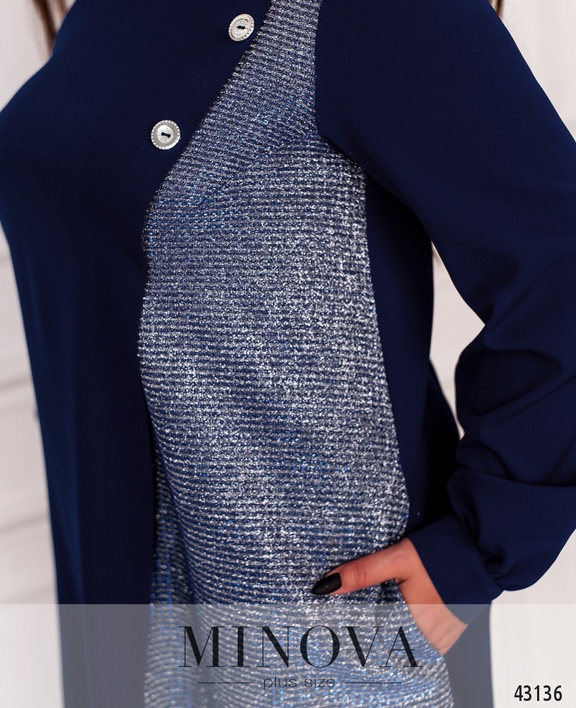Нарядное платье плюс сайз с блестящей вставкой слева. Платье подшито на запАх, по бокам - врезные карманы. Спинка однотонная. На груди - декоративные пуговицы, вырез горловины полукруглый. Рукава с манжетами, на манжетах по одной пуговке. Застёжек нет.