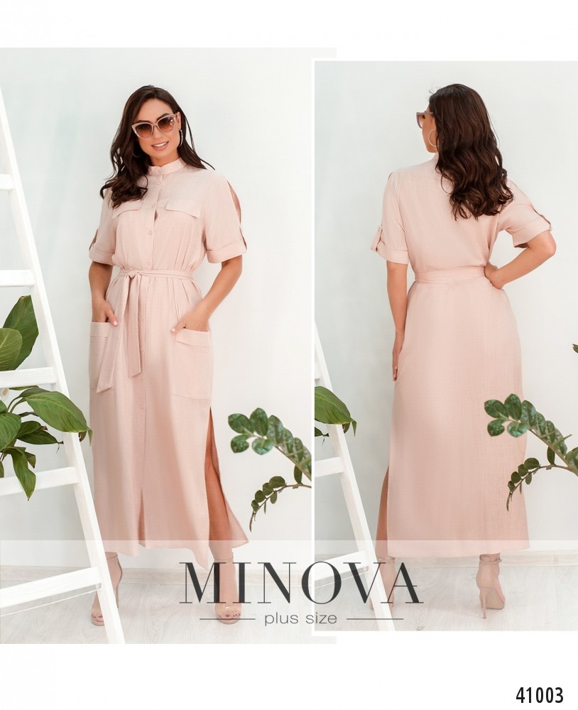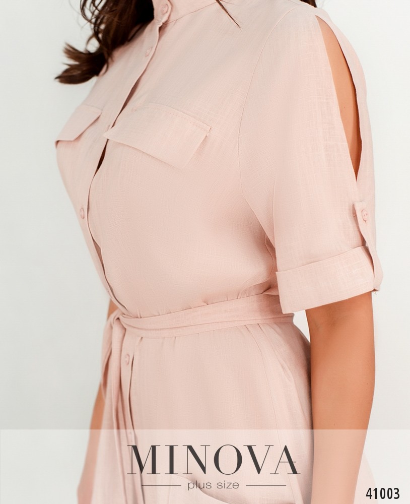 Лёгкое минималистичное платье в пастельных оттенках, большого размера. На груди - декоративные клапаны, на бёдрах - накладные карманы. Рукава с разрезом, цельными манжетами и регулировочной лентой. По бокам подола - небольшие разрезы. Воротничок небольшой. Застёгивается на ряд пуговиц на планке. В комплекте - пояс в тон.