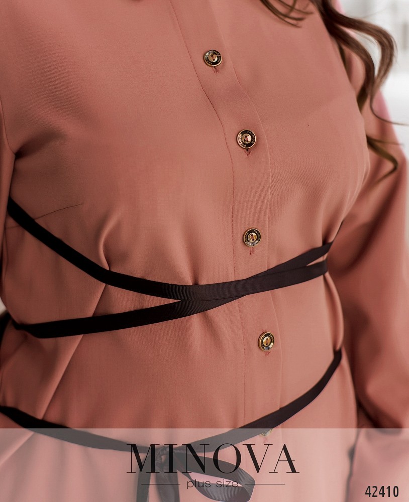 Привлекательное платье батал в стиле casual, с отложным воротничком и рядом пуговиц спереди на планке - от воротничка до подола. По бокам - врезные карманы. Рукава с манжетами, на манжетах по одной пуговице. В комплекте длинная лента, подчёркивающая линию талии. На концах ленты - небольшие набалдашники. По бокам подола - разрезы.