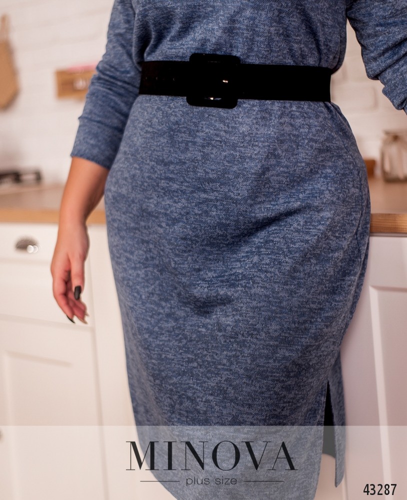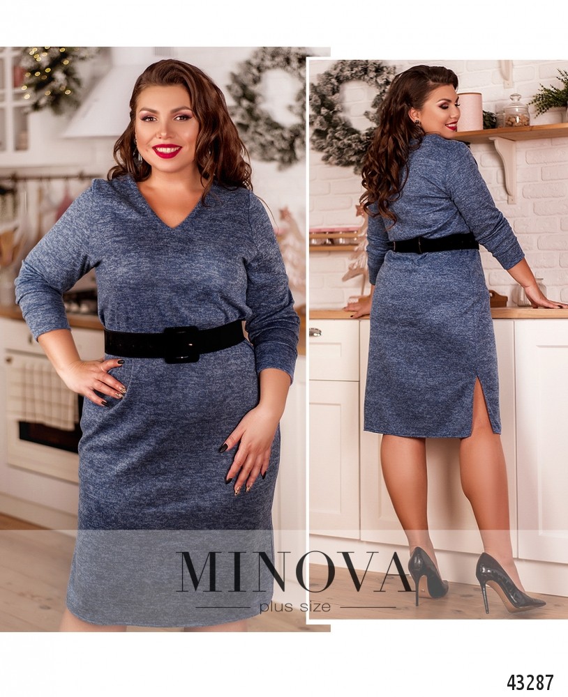 Элегантное платье батал с V-образным вырезом горловины, без застёжек и карманов. Рукава с мягкими манжетами. По бокам на подоле разрезы. В комплекте пояс.