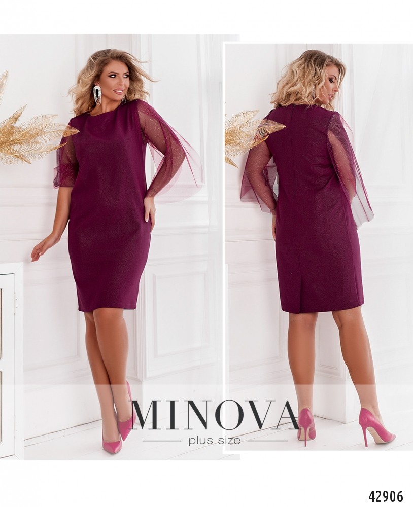 Элегантное платье батал с рукавами "лепесток" на запАх из нежного мерцающего фатина с напылением. Вырез горловины полукруглый, карманов нет. Застёжка - вшитая по спинке молния. Сзади на подоле шлица, на груди вытачки.