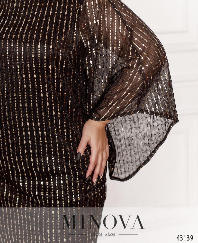 Очаровательное вечернее платье с блестящим декором, рукав фасона "кимоно" - узкий у плеча, расширяющийся к запястьям. Под полупрозрачным верхним слоем - мягкий нижний слой. Застёжка - вшитая по спинке молния. На груди вытачки. Карманов нет.