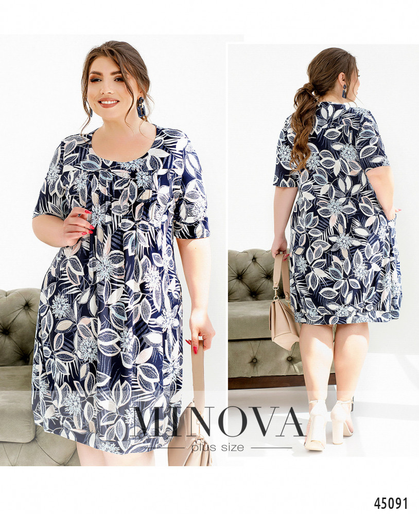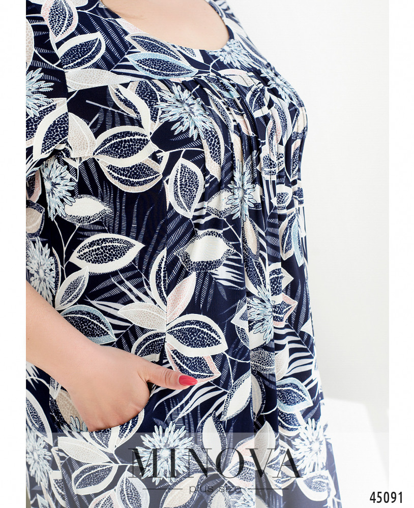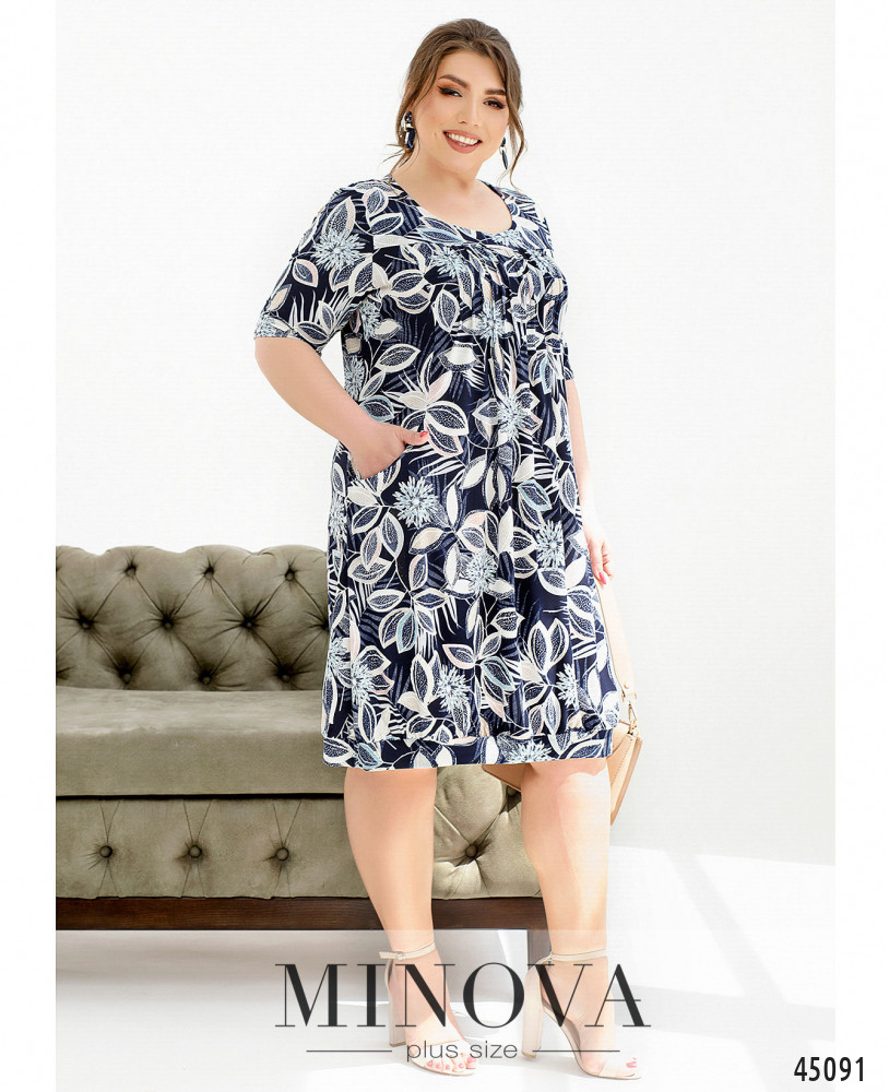 Яркое и привлекательное платье плюс сайз с принтом, рукава недлинные, без манжет. Есть карманы по бокам, расположенные вертикально. Застёжек нет. Ткань от груди присобрана и ниспадает складками. На подоле манжет. Вырез горловины полукруглый.