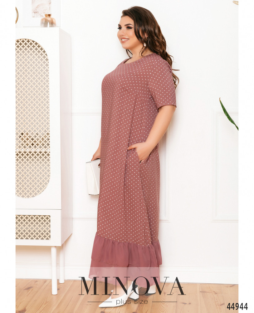 Элегантное и яркое платье батал с полукруглым вырезом горловины, по бокам - карманы в шве, застёжек нет. Рукава без манжет. На подоле снизу оборки, на груди - диагональные вытачки.