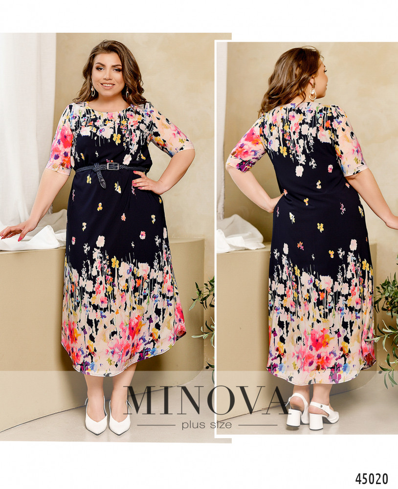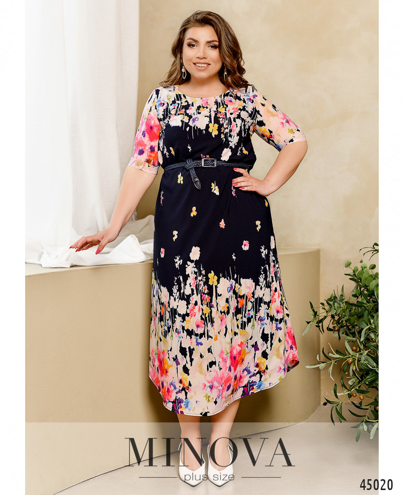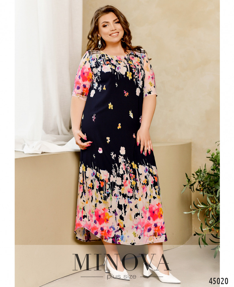 Стильное платье батал с ярким принтом, без застёжек и карманов, рукава без манжет, на груди вытачки. Подол по краям скруглённый. Вырез горловины полукруглый.