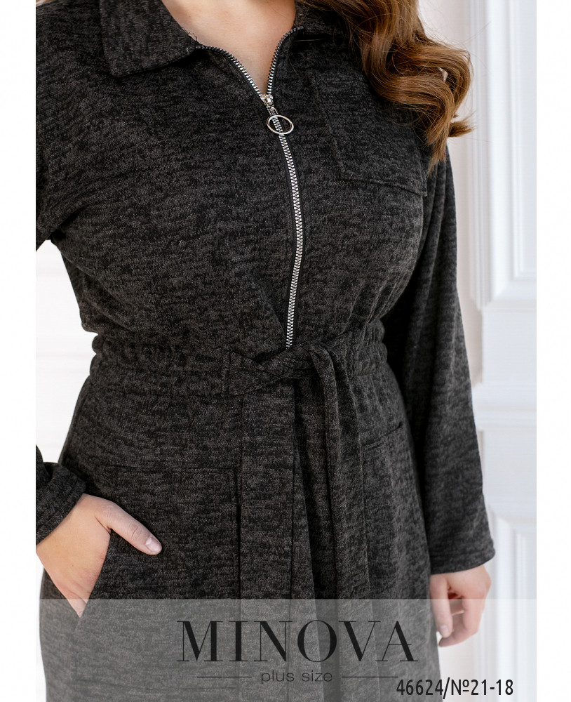 Стильное платье миди может в полной мере подчеркнуть достоинства фигуры и помочь создать женственный и нежный образ. Модель дополнена длинными рукавами с приспущенной линией плеч, небольшим воротником, от которого начинается змейка, вшитая на груди по центру, и накладными карманами на груди и бедрах спереди. Линию талии подчеркивает вшитый в нее пояс и резинка.
