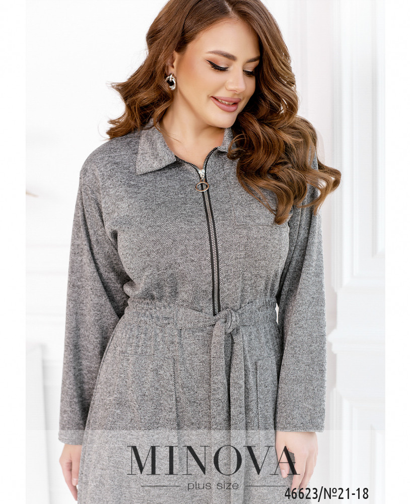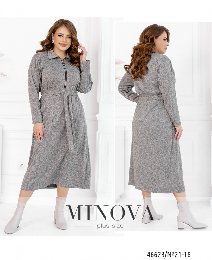 Стильное платье миди может в полной мере подчеркнуть достоинства фигуры и помочь создать женственный и нежный образ. Модель дополнена длинными рукавами с приспущенной линией плеч, небольшим воротником, от которого начинается змейка, вшитая на груди по центру, и накладными карманами на груди и бедрах спереди. Линию талии подчеркивает вшитый в нее пояс и резинка.
