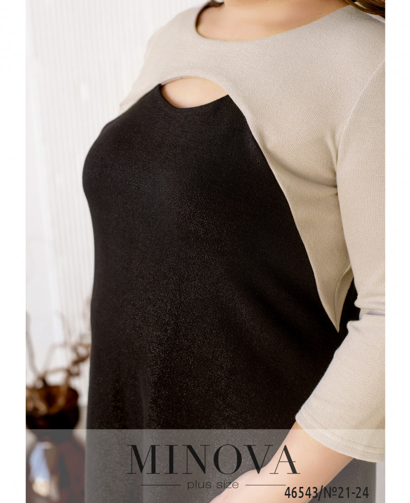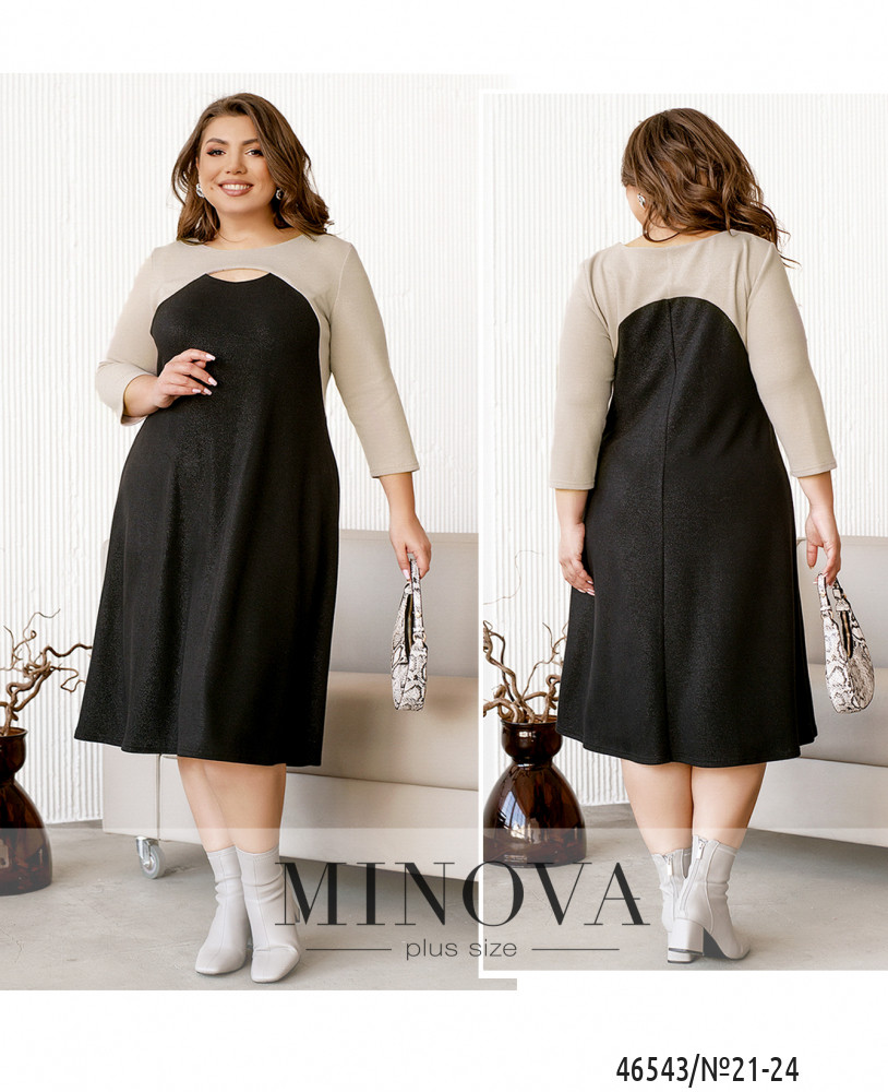 Контрастное платье может в полной мере подчеркнуть достоинства фигуры и помочь создать женственный и нежный образ. Спереди под полукруглым вырезом горловины – ещё один небольшой вырез, от которого продолжаются вытачки до подмышки. Платье свободного кроя, А-силуэта. Застёжки отсутствуют, по бокам – врезные карманы. Модель длины миди, так что вы можете сочетать его с обувью на каблуке или танкетке.