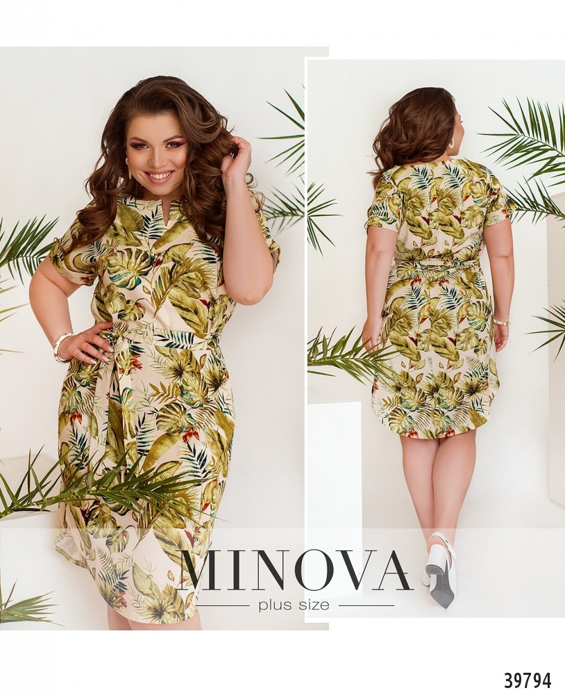 Привлекательное платье большого размера с ярким принтом, без карманов и застёжек, в комплекте - пояс. Рукава с небольшими отворотами. Вырез горловины - неглубокий, V-образный.