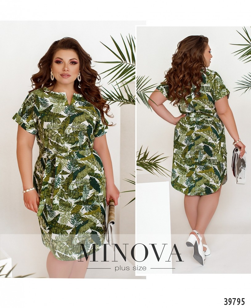 Привлекательное платье большого размера с ярким принтом, без карманов и застёжек, в комплекте - пояс. Рукава с небольшими отворотами. Вырез горловины - неглубокий, V-образный.