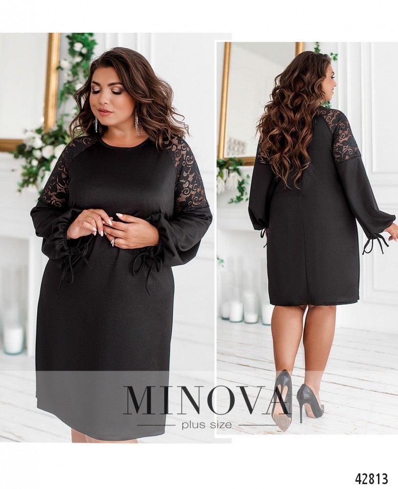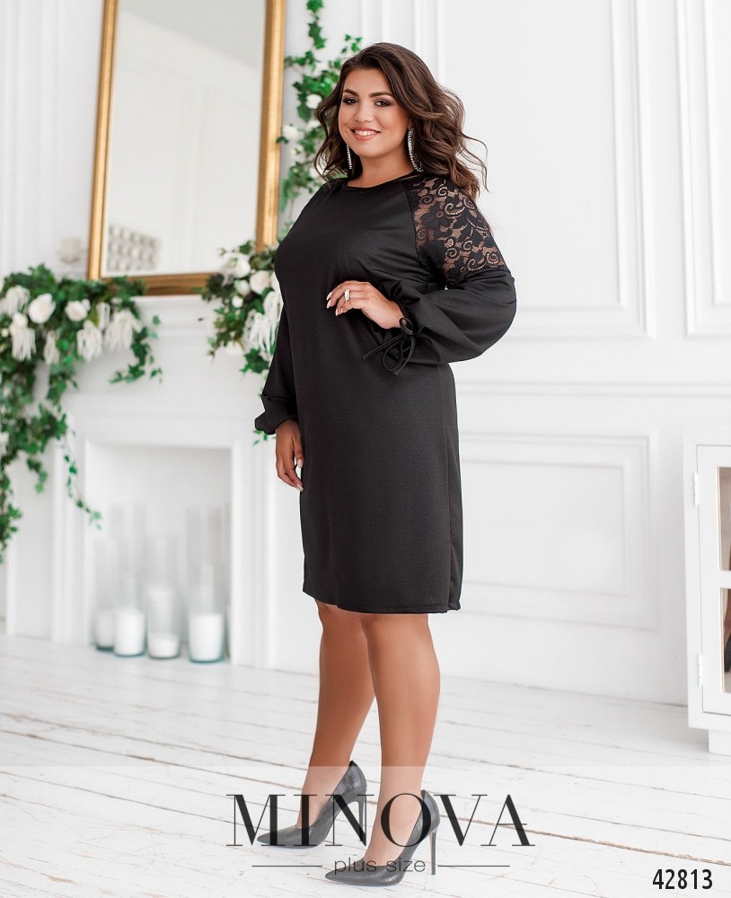 Элегантное платье большого размера с кружевной вставкой на плечах. Рукава сужаются к запястьям, завязываются на тесёмки. На груди вытачки. Застёжка - молния, вшитая по спинке. Карманов нет. Ткань с люрексом, изнутри гладкая.