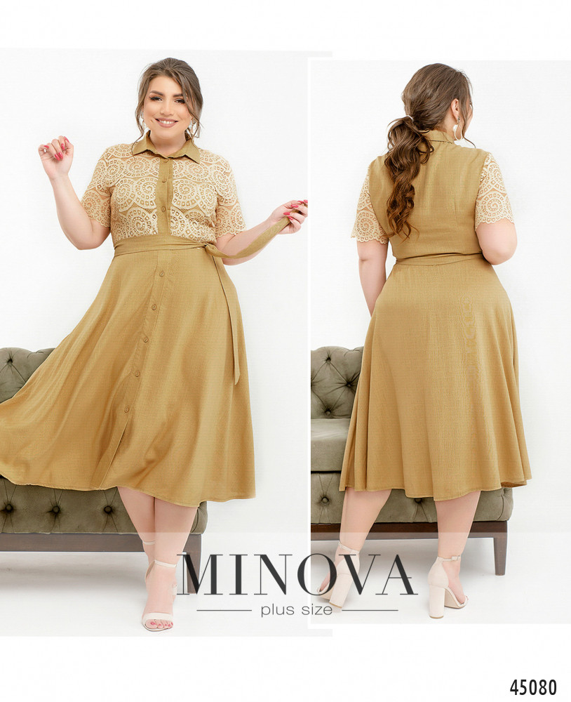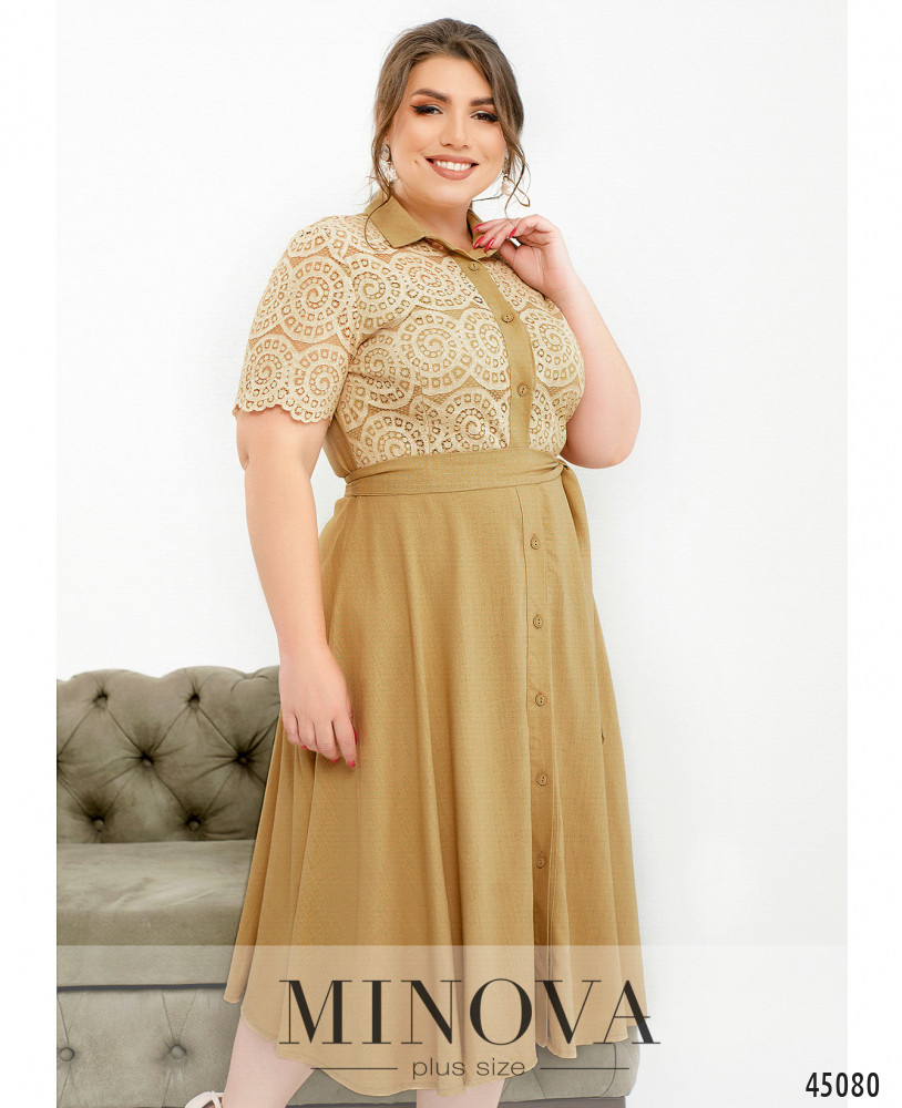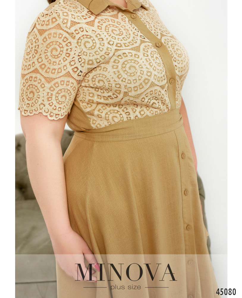 Нежное изящное платье с воротником, изюминкой которого является ажурный кружевной лиф с короткими рукавами и нагрудными вытачками. Впереди удобная застежка на пуговицах на планке. Спинка лаконичная без кружевных вставок и с вытачками.
