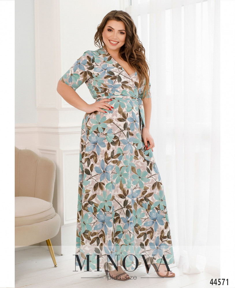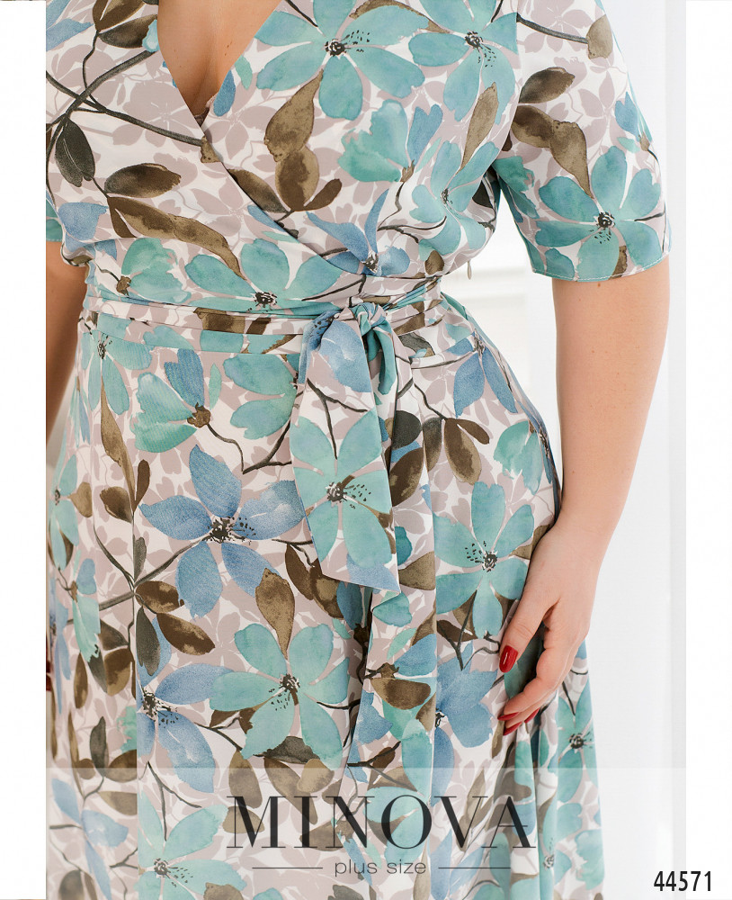 Элегантное и привлекательное платье плюс сайз с подшитым запАхом, подол расклешён. Рукава короткие, без манжет. Карманов нет. Застёжка - молния, вшитая слева. В наличии подшитый пояс.