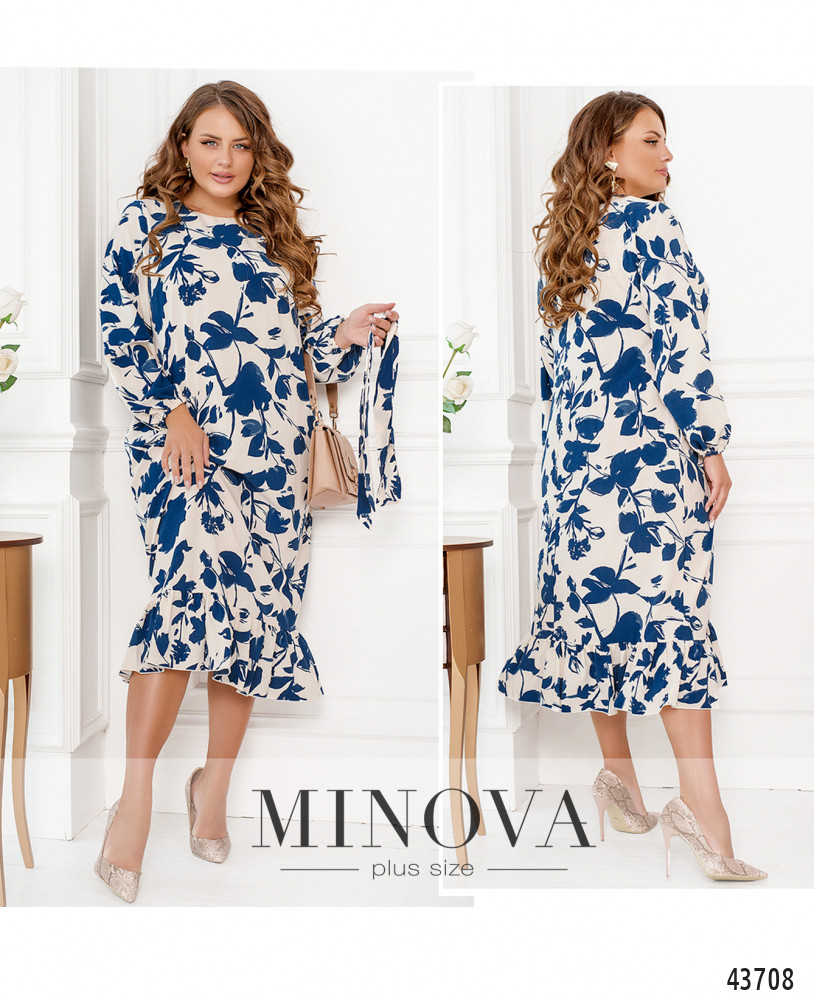 Стильное, женственное платье большого размера из ультрамягкой и практичной ткани софт. Платье с ярким принтом, цельнокроеное, декорировано по подолу оборкой, по бокам - врезные карманы. В рукава на запястьях вшиты манжеты, застёжка - пуговка сзади под шеей.