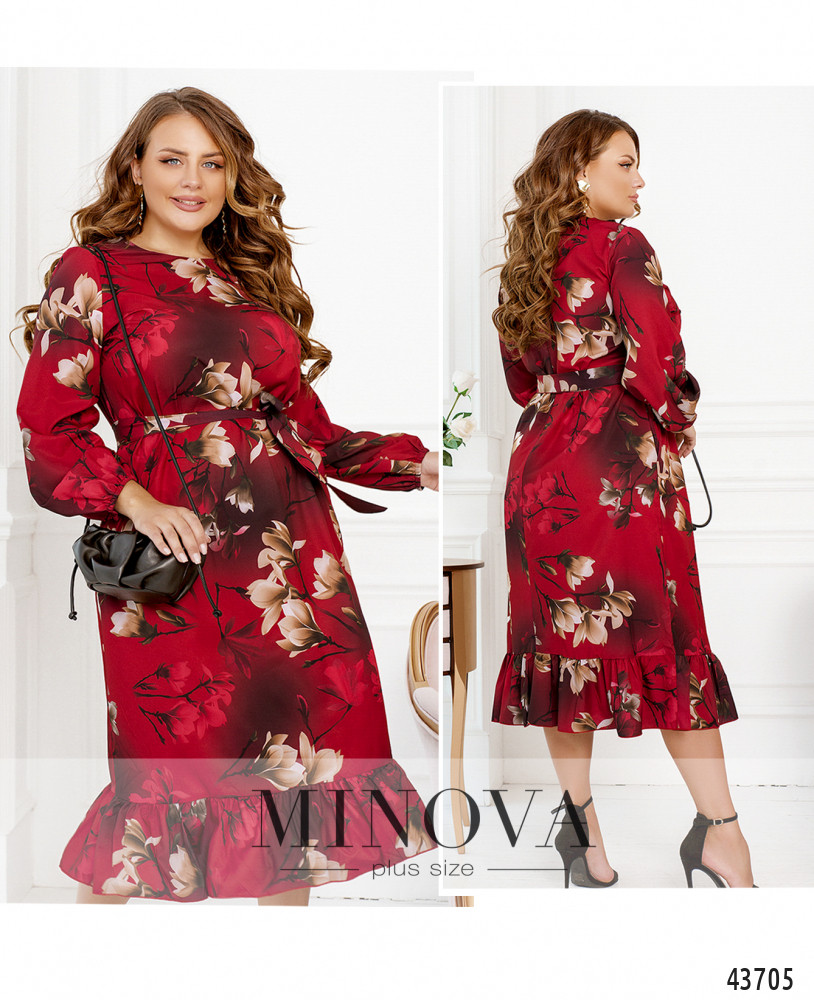 Стильное, женственное платье большого размера из ультрамягкой и практичной ткани софт. Платье с ярким принтом, цельнокроеное, декорировано по подолу оборкой, по бокам - врезные карманы. В рукава на запястьях вшиты манжеты, застёжка - пуговка сзади под шеей.