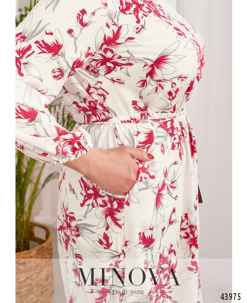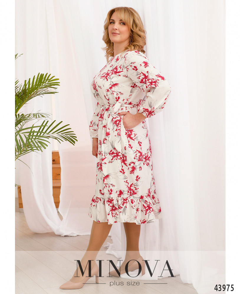 Нежное и романтичное платье батал, цельнокроеное, по бокам - карманы в шве. Подол украшен оборками, в рукава на запястьях вшиты резинки, ткань присобрана оборками на манжетах. Застёжка - пуговка сзади под шеей. В комплекте пояс в тон. Вырез горловины полукруглый.