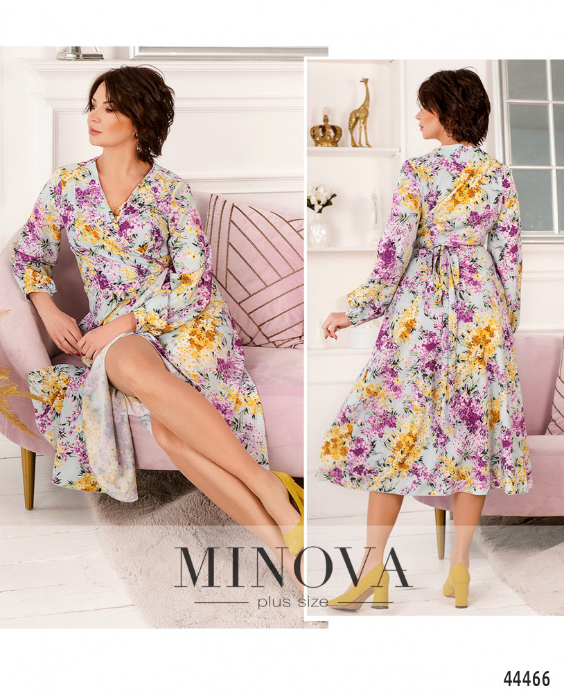 Нежное и яркое платье батал на запАх, по бокам - карманы в шве. Рукава с манжетами, на манжетах по одной пуговице. Завязывается с помощью ленты, продеваемой в отверстие на талии сбоку. Без подкладки. Подол отрезной.