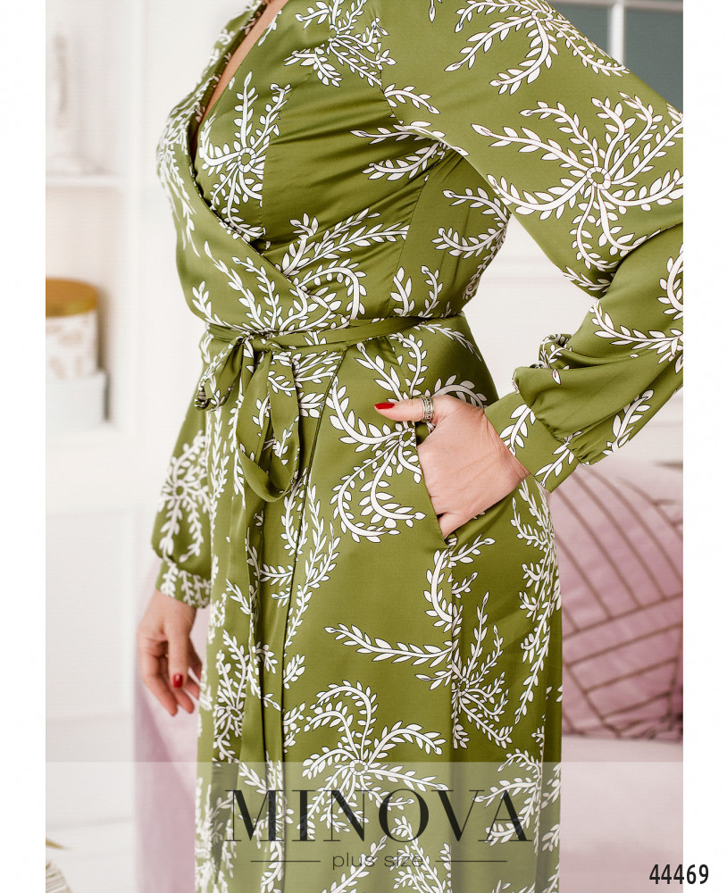 Нежное и яркое платье батал на запАх, по бокам - карманы в шве. Рукава с манжетами, на манжетах по одной пуговице. Завязывается с помощью ленты, продеваемой в отверстие на талии сбоку. Без подкладки. Подол отрезной.