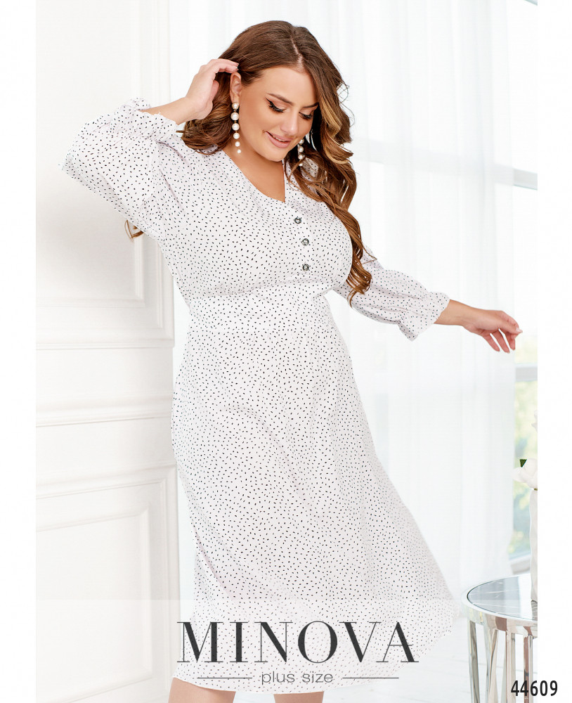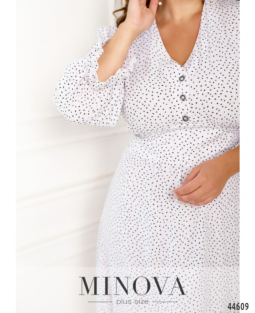 Оригинальное платье плюс сайз с отрезным лифом и подолом. На талии подшит пояс, который завязывается сзади. Также сзади в талию вшита резинка. По бокам - карманы в шве. На груди несколько небольших пуговиц, вырез горловины V-образный. В рукава на манжетах вшиты резинки, манжеты с оборками.