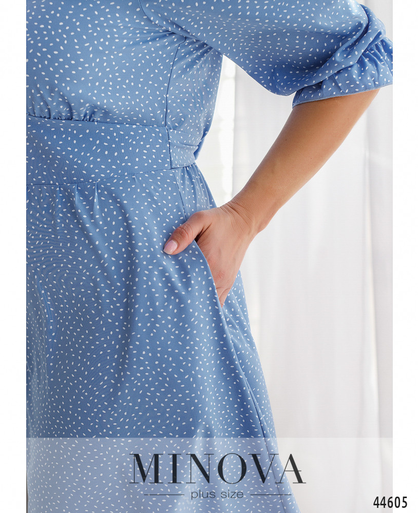 Оригинальное платье плюс сайз с отрезным лифом и подолом. На талии подшит пояс, который завязывается сзади. Также сзади в талию вшита резинка. По бокам - карманы в шве. На груди несколько небольших пуговиц, вырез горловины V-образный. В рукава на манжетах вшиты резинки, манжеты с оборками.