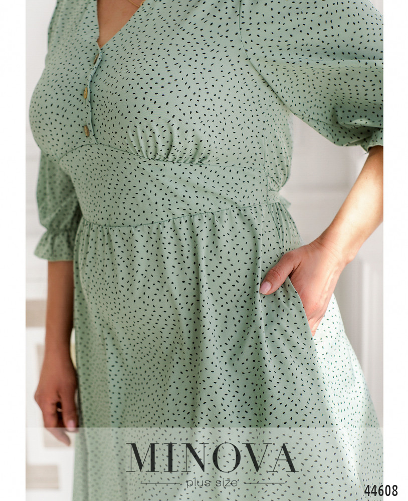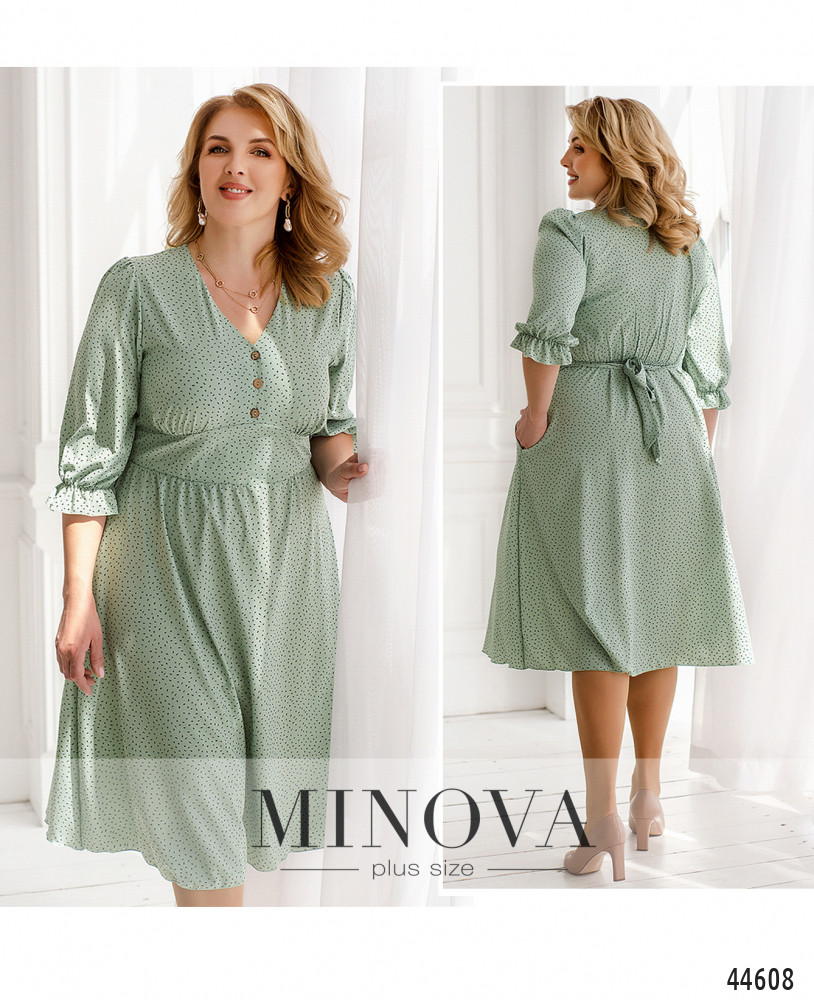 Оригинальное платье плюс сайз с отрезным лифом и подолом. На талии подшит пояс, который завязывается сзади. Также сзади в талию вшита резинка. По бокам - карманы в шве. На груди несколько небольших пуговиц, вырез горловины V-образный. В рукава на манжетах вшиты резинки, манжеты с оборками.