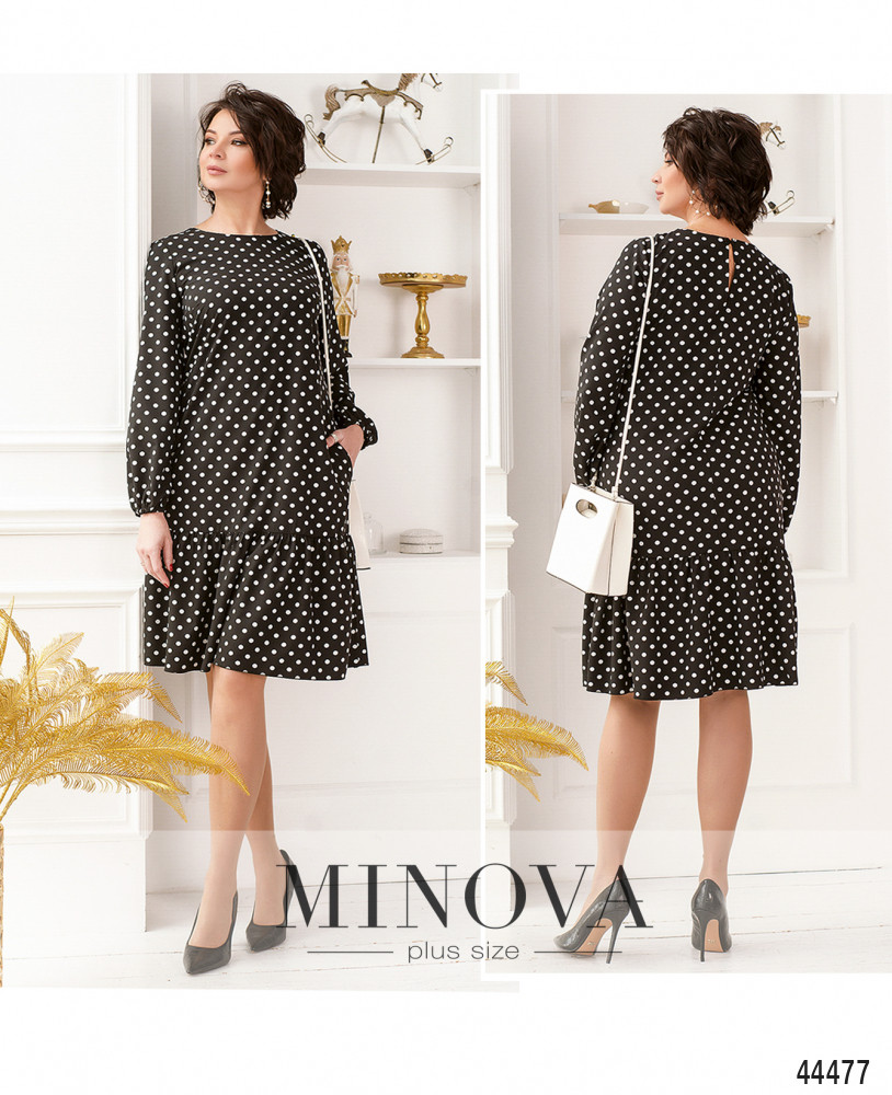 Стильное платье плюс сайз А-силуэта, украшенное оборками на подоле. Застёжка - пуговка сзади под шеей, по бокам - карманы в шве. В рукава на запястьях вшиты резинки. На груди вытачки. Вырез горловины полукруглый.