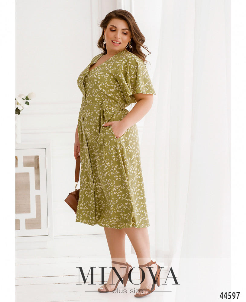 Элегантное и нежное платье батал с рукавами-крылышками, по бокам - карманы в шве, застёгивается на ряд пуговиц спереди на планке. Подол отрезной, в талию сзади вшита резинка, вырез горловины V-образный.