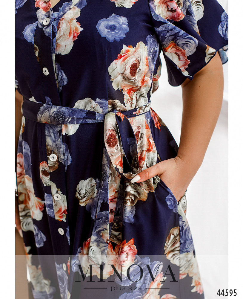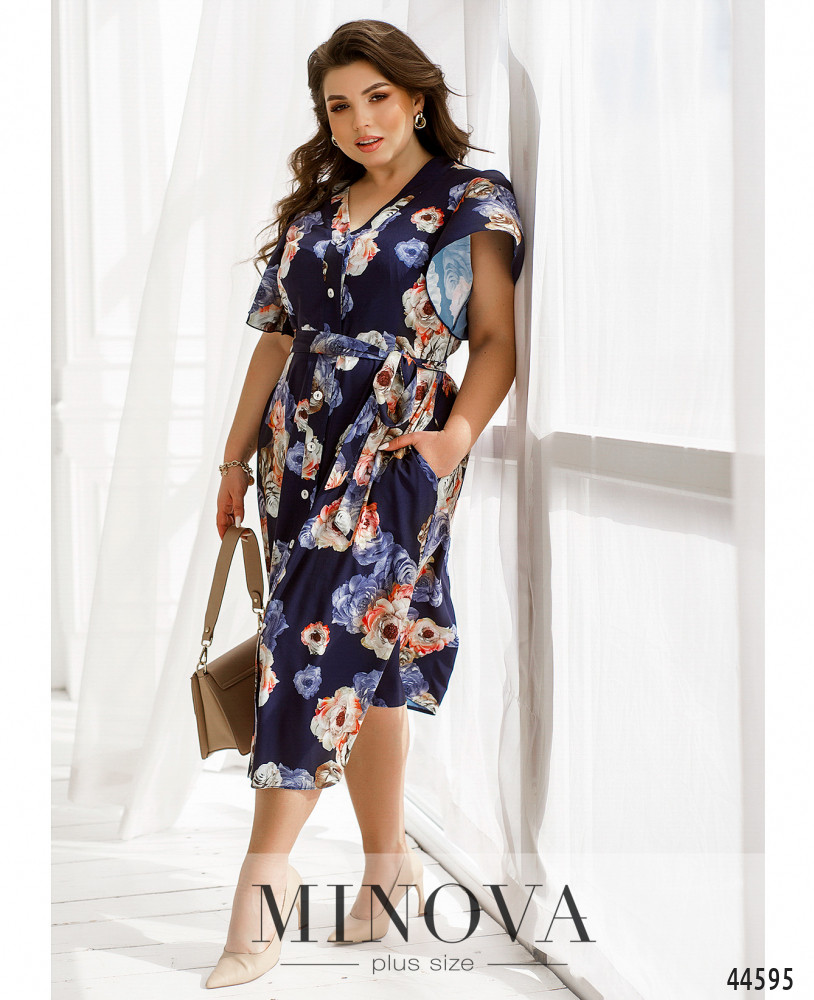Элегантное и нежное платье батал с рукавами-крылышками, по бокам - карманы в шве, застёгивается на ряд пуговиц спереди на планке. Подол отрезной, в талию сзади вшита резинка, вырез горловины V-образный.