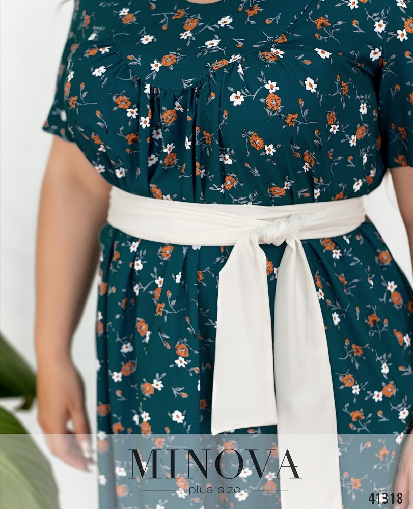 Яркое платье плюс сайз с цветочным принтом, по бокам - врезные карманы. Рукава свободные, без манжет. На груди - декоративные складки, расширяющие подол. По бокам подола небольшие разрезы. В комплекте прилагается контрастный пояс. Застёжек нет. Модель свободного покроя.