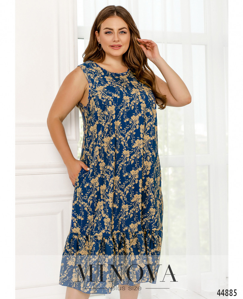 Женственное платье батал без рукавов, вырез горловины полукруглый, на подоле - мягкие оборки. По бокам карманы в шве. Застёжек нет.