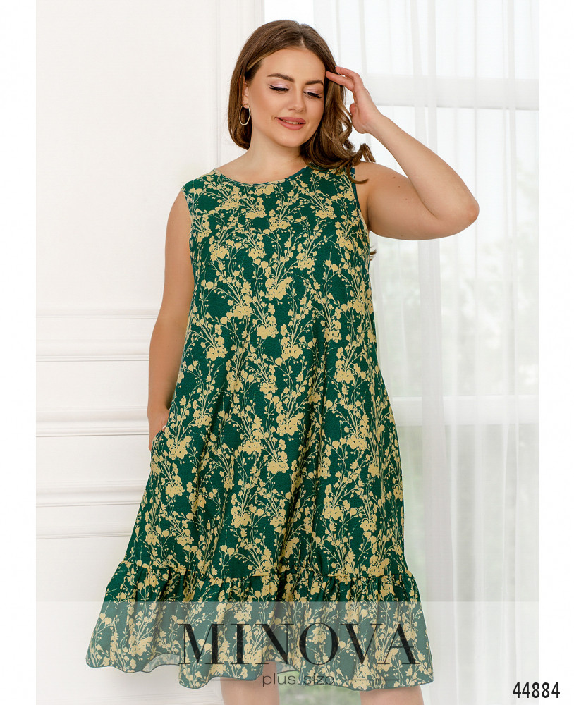 Женственное платье батал без рукавов, вырез горловины полукруглый, на подоле - мягкие оборки. По бокам карманы в шве. Застёжек нет.