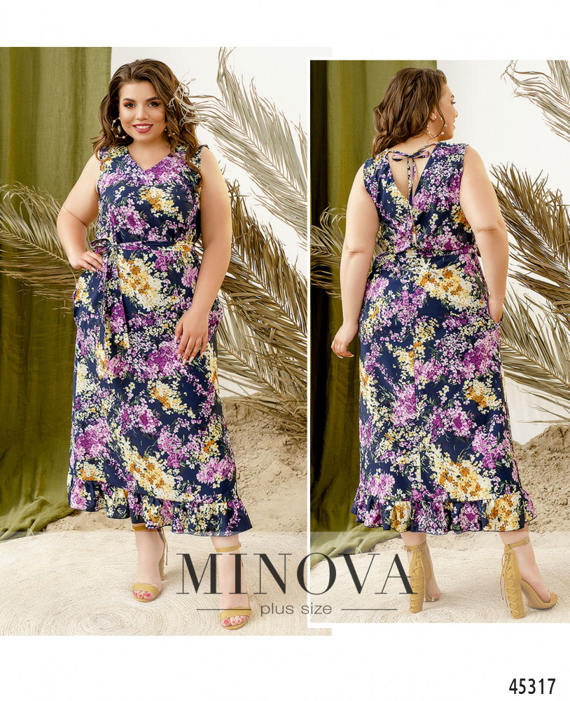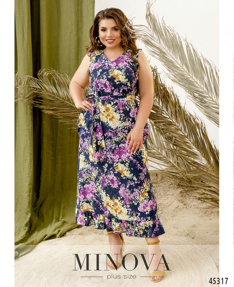 Яркое летнее платье макси с цветочным принтом выполнено из  легкой ткани, поэтому вы будете чувствовать себя в нем комфортно даже в самые жаркие дни. Кокетливая оборка на подоле и неглубокий V-образный вырез спереди и на спинке добавят женственности в ваш образ, а текстильный пояс, который идет в комплекте, поможет создать приталенный силуэт из свободного.