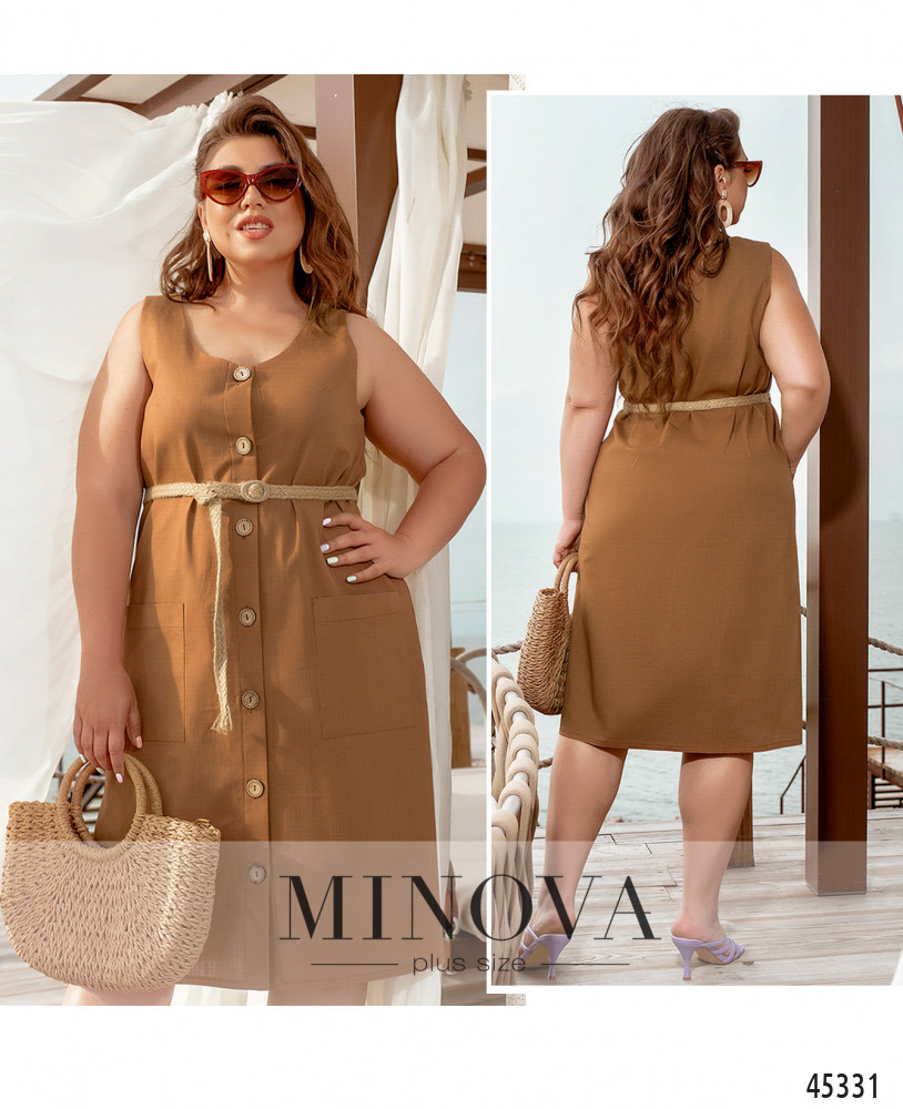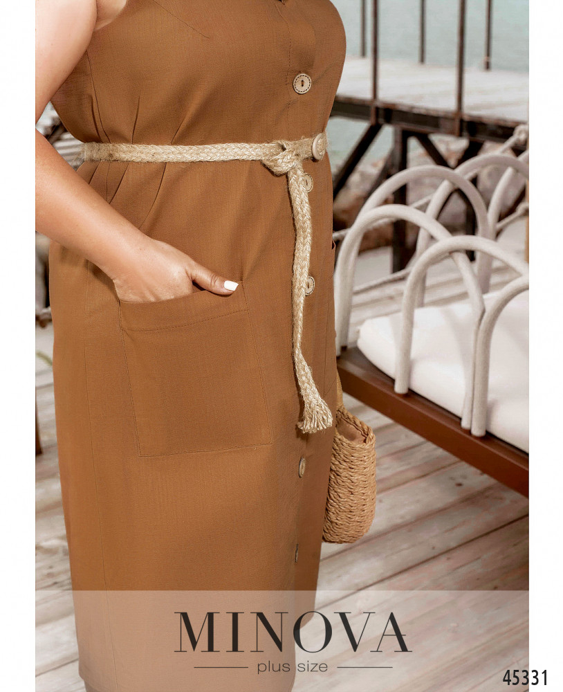 Лаконичное однотонное платье с накладными карманами и застежкой спереди на пуговицах выполнено из легкой дышащей ткани. Меняйте его силуэт от прямого к приталенному с помощью тонкого плетеного пояса, который идет в комплекте. Дополните эту модель босоножками, балетками или кедами для создания яркого летнего образа в стиле casual.