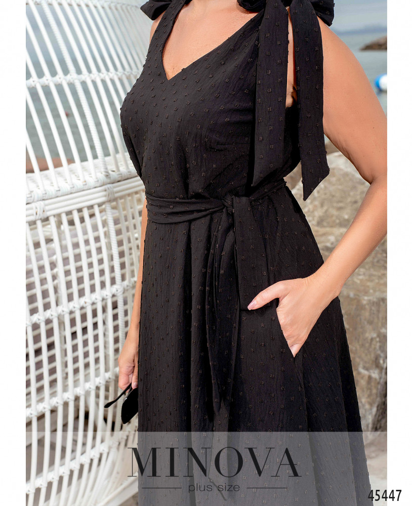 Лаконичное отрезное платье макси с карманами в боковых швах,  выполненное из однотонной текстурной ткани, поможет вам создать нежный и чувственный образ. Кокетливые завязки на плечах и V-образный вырез горловины добавят женственности, а текстильный пояс в тон, который идет в комплекте, сделает образ завершенным.