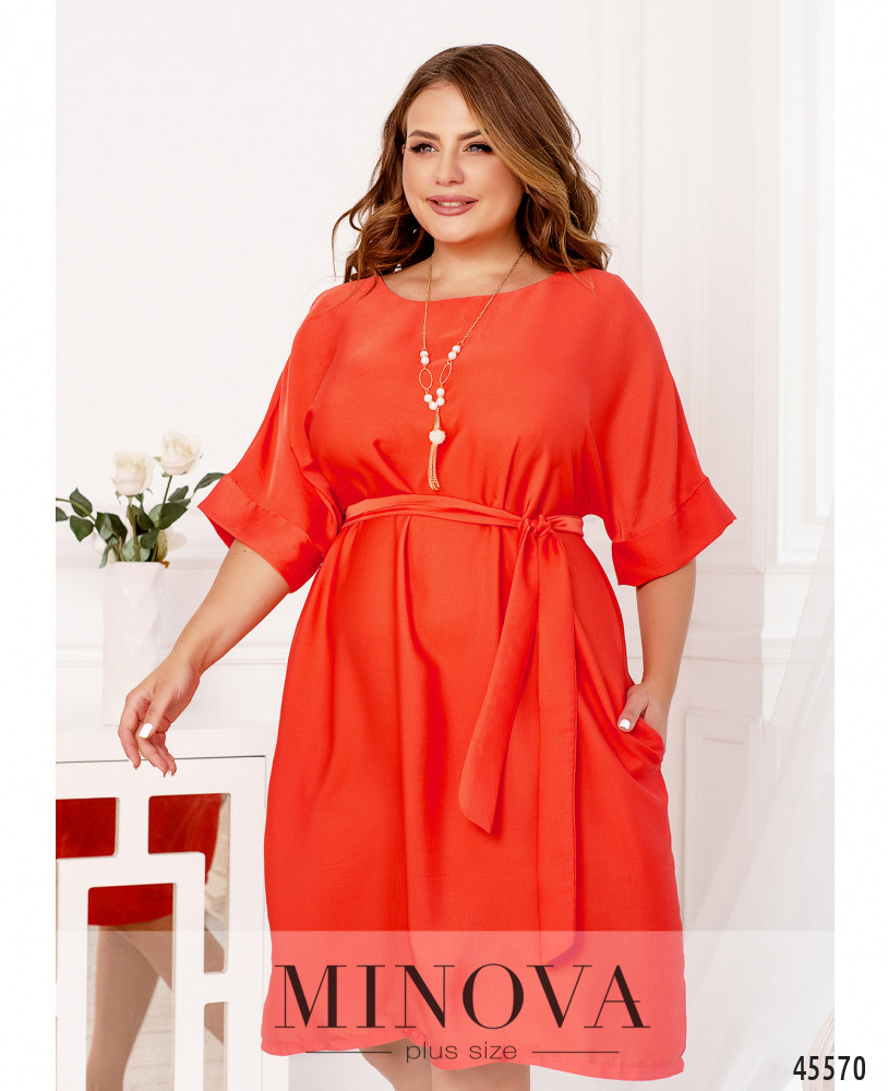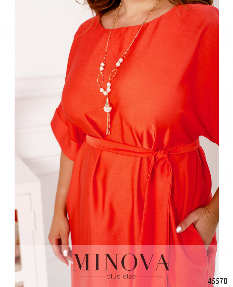 Яркое однотонное платье свободного кроя с широкими рукавами "летучая мышь" с манжетами позволит вам выглядеть роскошно даже в повседневном образе. Лаконичный крой этой модели с полукруглым вырезом горловины дополнен карманами в боковых швах.
