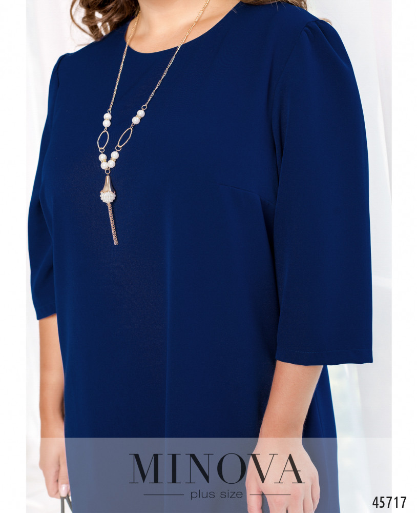 Элегантное и минималистичное платье с полукруглым широким вырезом горловины. Рукав свободный без манжета длиной 3/4. Застёжек нет. На груди диагональные вытачки. Украшение входит в комплект.