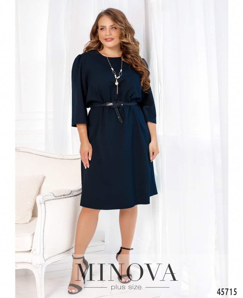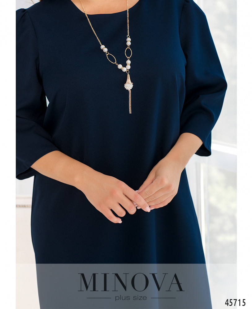 Элегантное и минималистичное платье с полукруглым широким вырезом горловины. Рукав свободный без манжета длиной 3/4. Застёжек нет. На груди диагональные вытачки. Украшение входит в комплект.